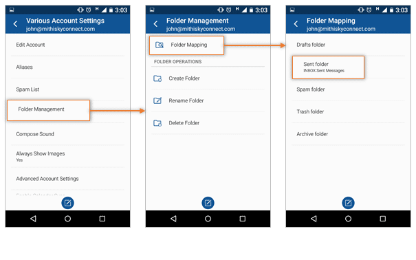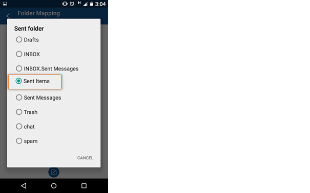 Tap to select the Sent Items folder on the server to save a copy of email sent from your mobile device.